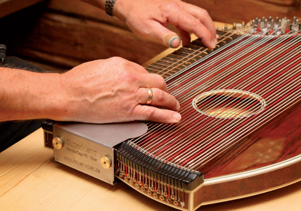Das Stützblech schwebt unverrückbar über den Saiten. Die rechte Hand ruht ermüdungsfrei auf der Ablage. Die Hand befindet sich weiter innen, also näher am Schallloch, dadurch weicherer Klang. Der Einsatz des kleinen Fingers für Terz-Wechselbässe wird problemlos möglich. Es sind mehr Saiten gleichzeitig erreichbar für mehr Klangfülle. Das verwendete Edelstahl-Material ermöglicht ein ruckfreies Gleiten auf der Ablage. Die Handauflage kann an unterschiedliche Korpushöhen angepasst werden. Passt in jeden Zitherkoffer, keine Demontage notwendig.